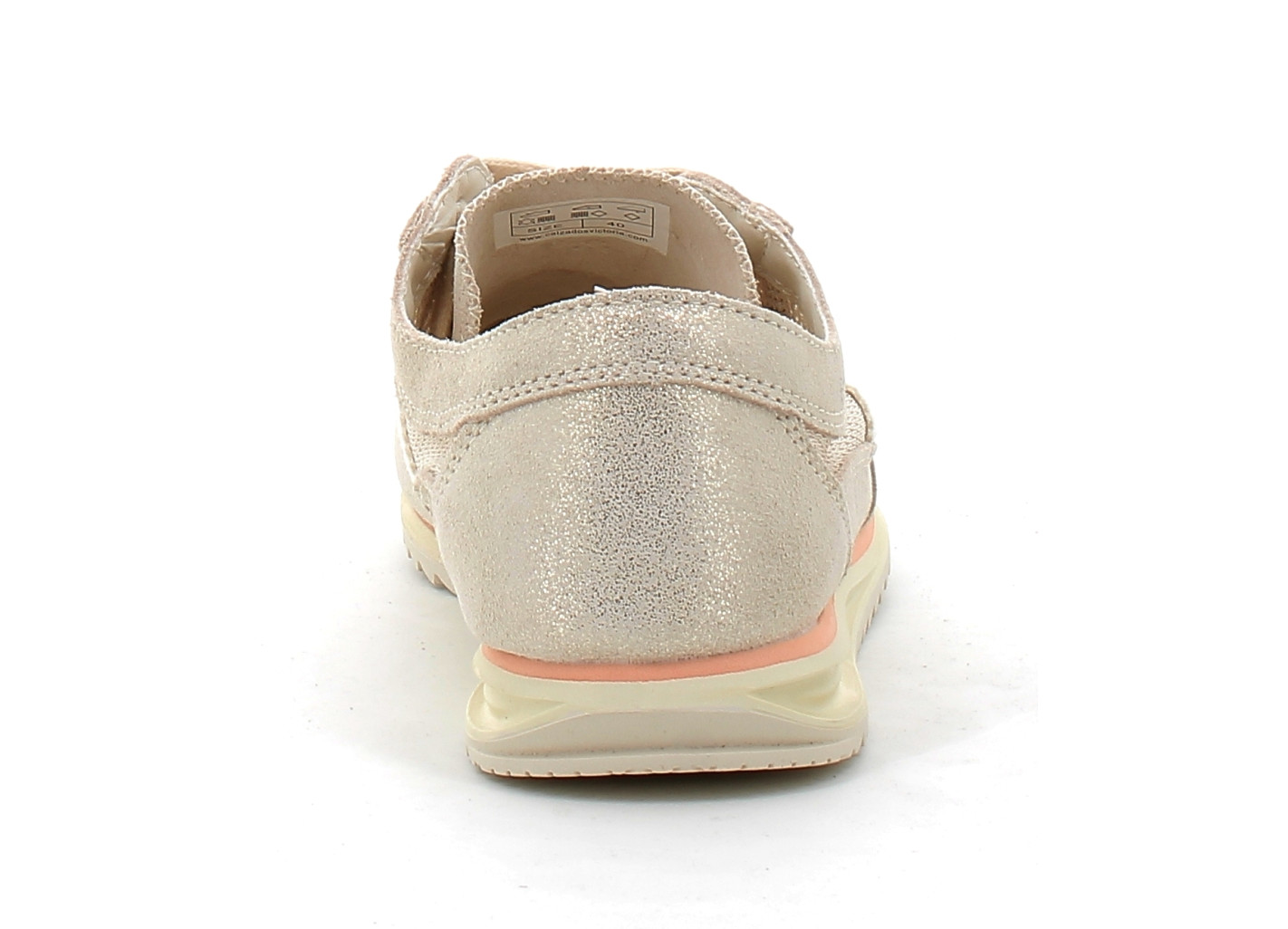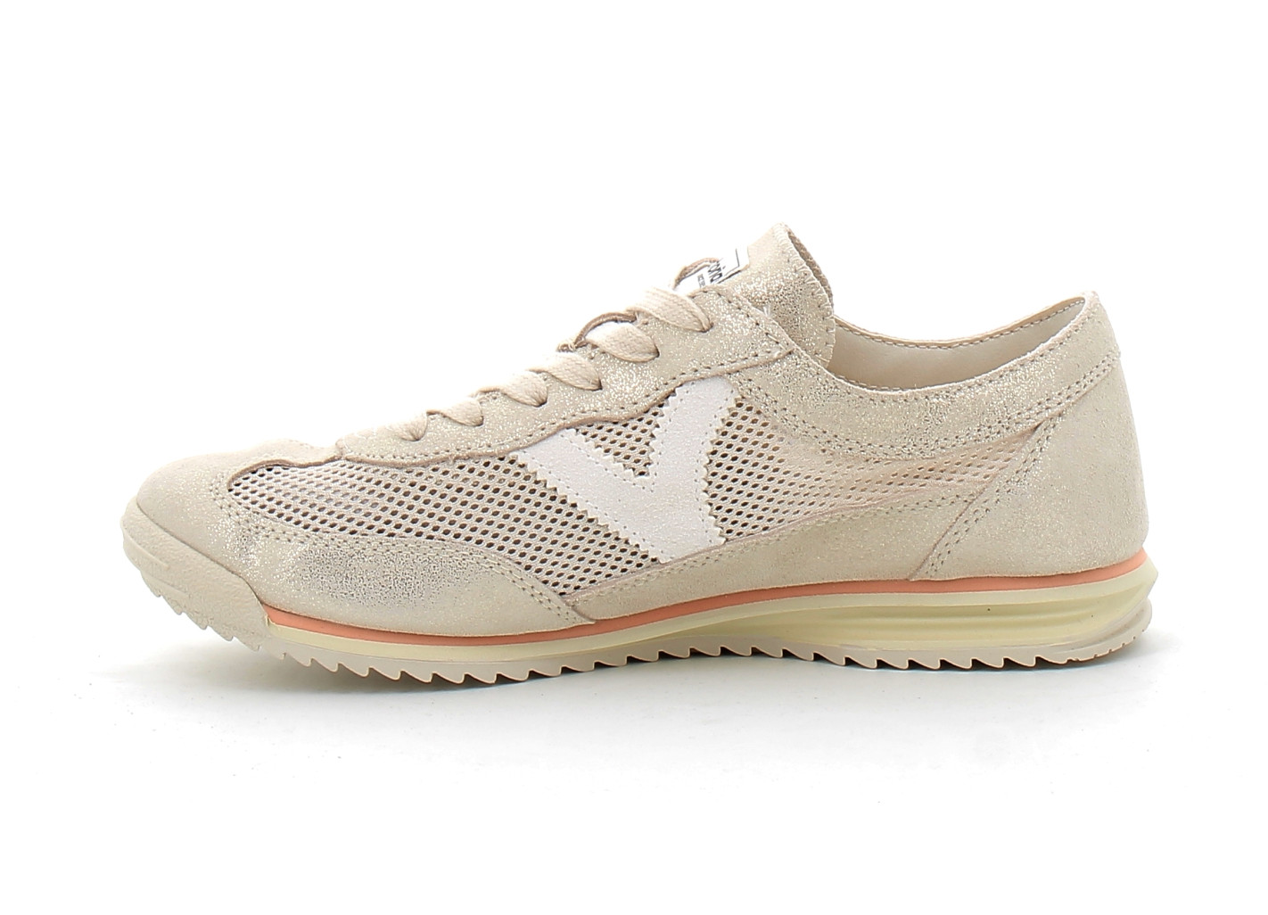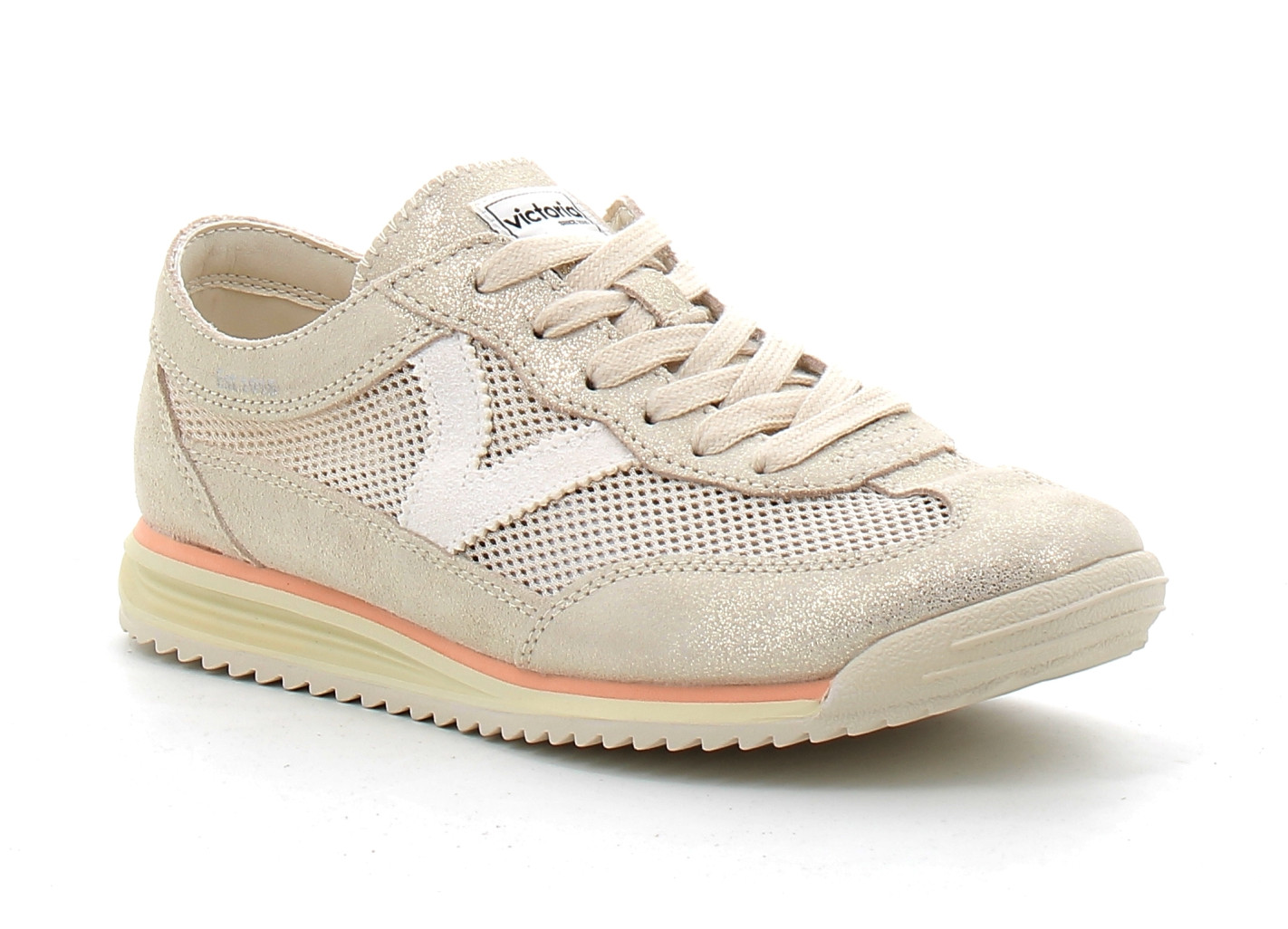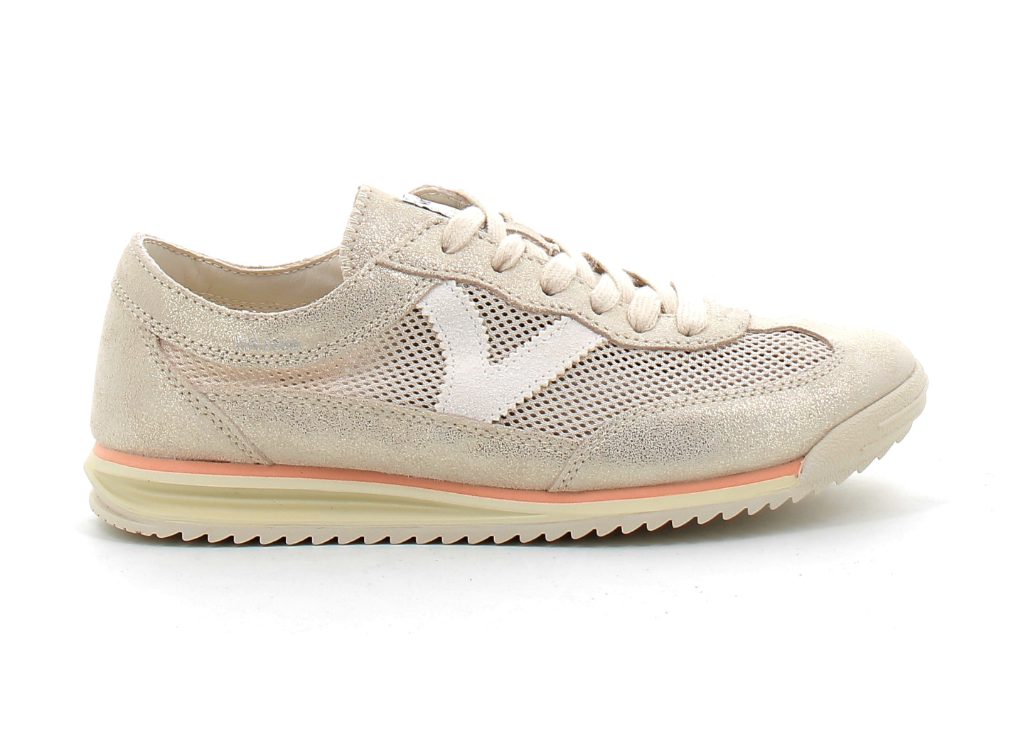 Sneaker féminine au style vintage et glamour, la Saturno Platino se distingue par ses reflets métallisés argentés et ses empiècements en daim qui lui donnent un caractère unique. Le logo "V" sur le côté apporte la signature authentique de la marque Victoria.